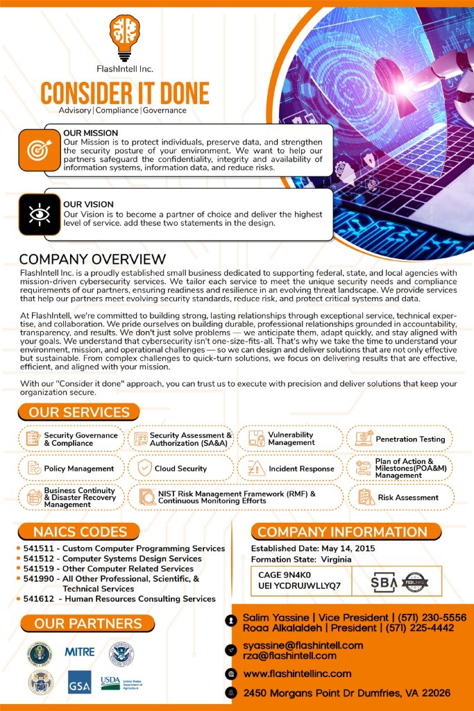 FlashIntell Inc. is a proudly established small business dedicated to supporting federal, state, and local agencies with mission-driven cybersecurity services. We tailor each service to meet the unique security needs and compliance requirements of our partners, ensuring readiness and resilience in an evolving threat landscape. We provide services that help our partners meet evolving security standards, reduce risk, and protect critical systems and data.